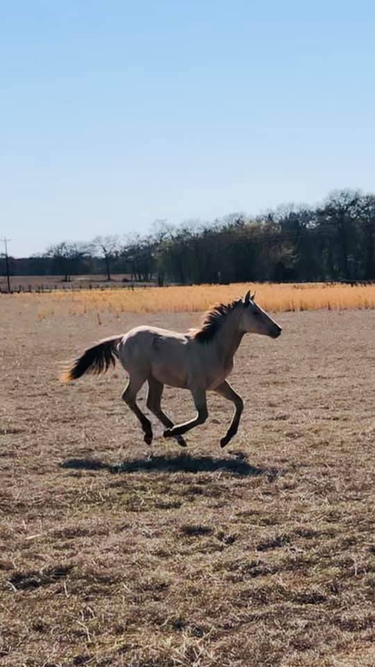 Denny is a beautiful 2-year-old lined-dun quarter horse. He was rescued from a kill pen at 8 months of age in February 2020. Even at a young age with his turned-out rear hooves, it was clear Denny was going to be an impressive quarter horse. He has a wide chest, strong shoulders, and the perfect peach-shaped butt. Within 2 farrier visits, his hind legs were straightened perfecting his form and line.